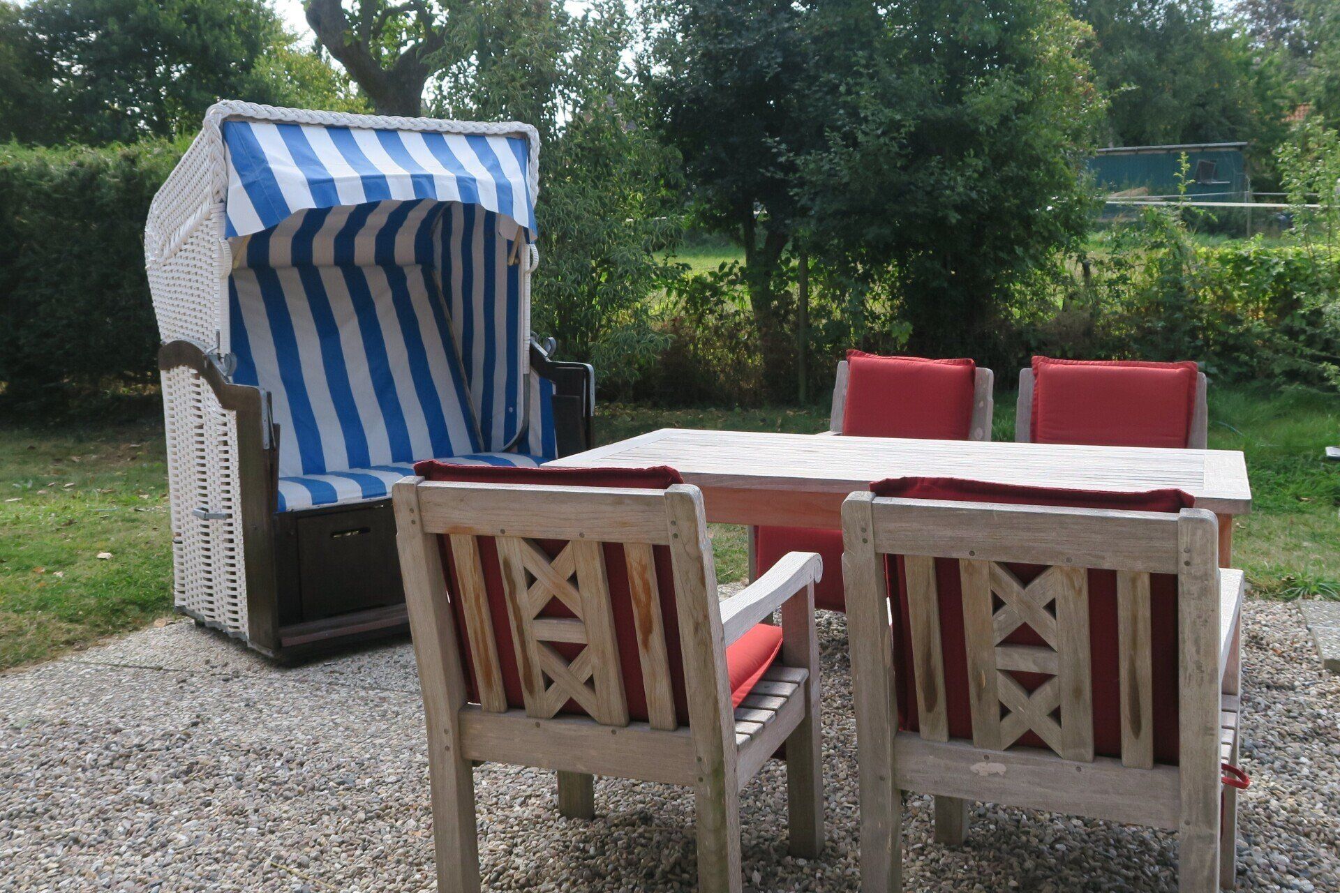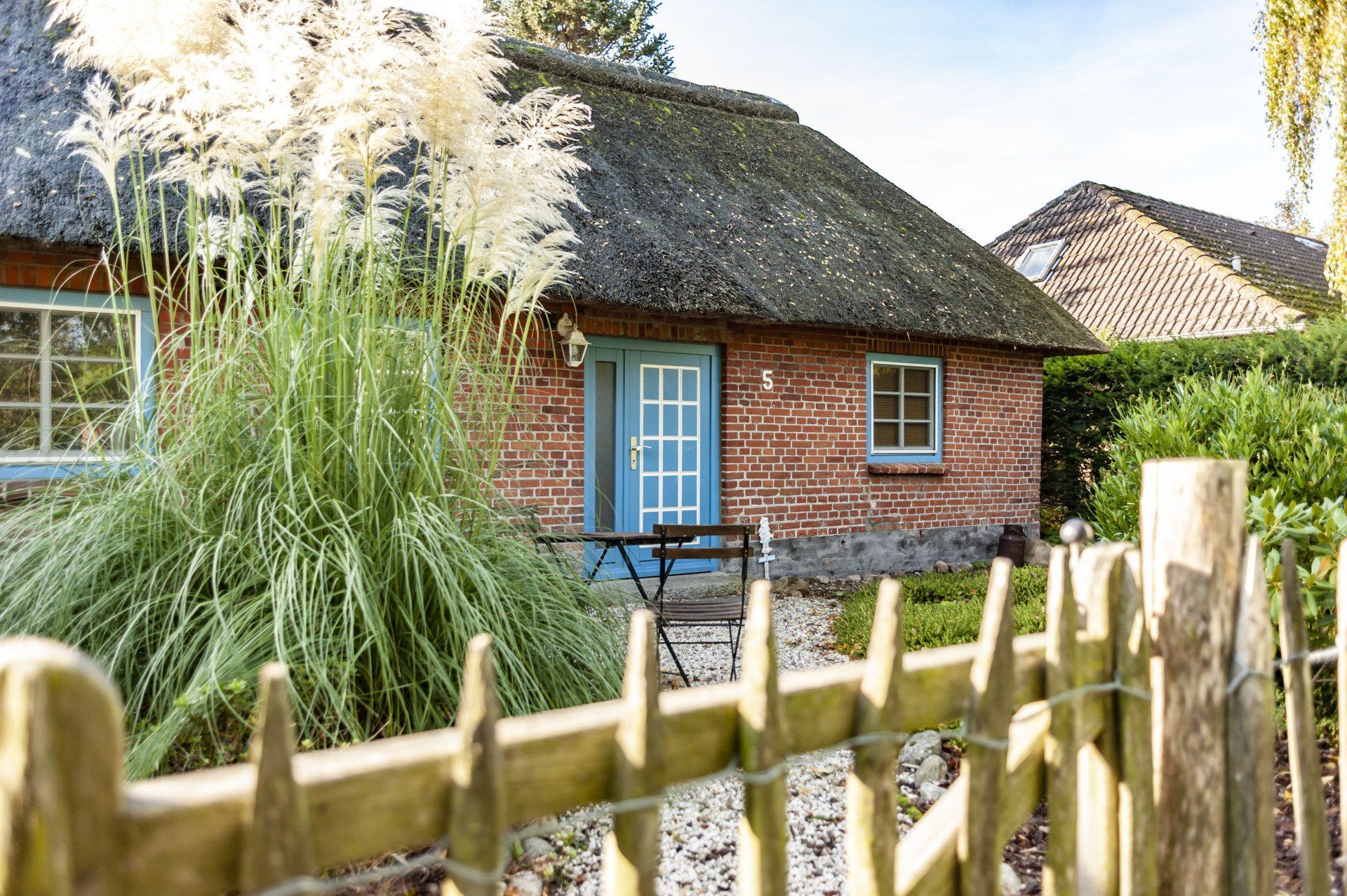 Schon der schöne Vorgarten der Kate lädt mit einem kleinen Bistrotisch und -stühlen zum Entspannen ein. Hier den Tag mit einem Kaffee in der Morgensonne zu beginnen, ist Urlaub pur.