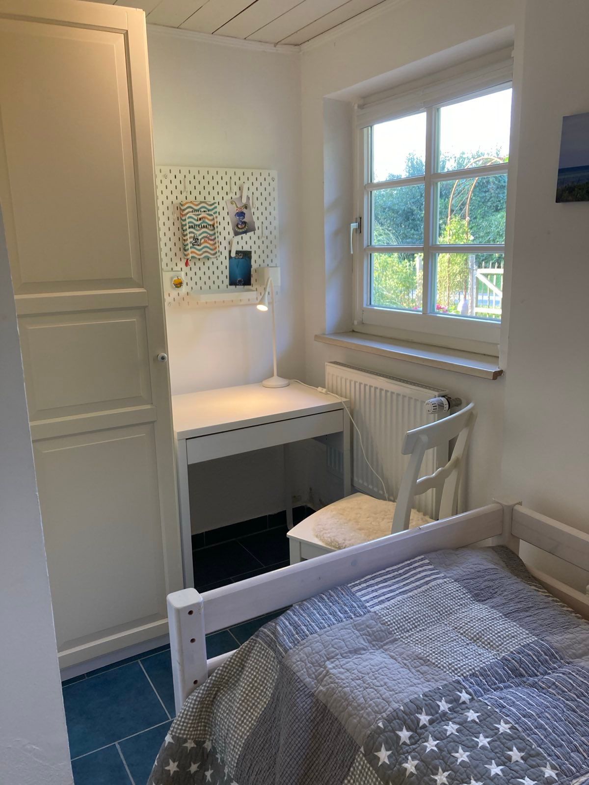 verfügt über einen kleinen Schreibtisch und einen Kleiderschrank mit ausreichend Stauraum.